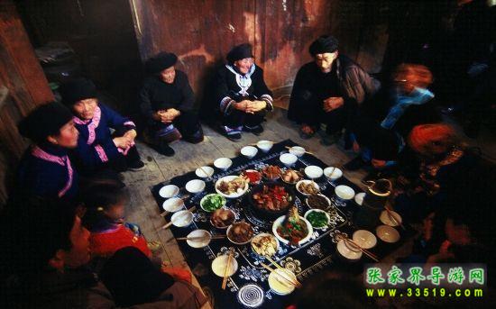 聚居于湘鄂川黔的土家族人過年,比其他民族要提前一二天。俗規(guī)農(nóng)歷臘月大,二十九過年,臘月小,則二十八過年,稱為過“趕年”。 土家族有著趕年的習俗,在農(nóng)歷臘月三十的早晨,土家族家家門口,都是紅燈高掛,鞭炮齊鳴。因為那是土家族人開始趕年的時候,開始吃午餐的時候。 土家人趕年時,先把菜全部上桌后,再盛一碗飯,加一些葷菜,飯碗上放一雙筷子,那時土家人先祭拜他們的祖先,然后家人上桌開始趕年。土家人年餐菜都必須是自家養(yǎng)的和自家產(chǎn)的,自家養(yǎng)的如豬、牛、羊、魚等,自家產(chǎn)的如紅薯粉、黃豆、青菜等等。 土家人的趕年餐每道菜都有它的含義。 土家三樣(血豆腐、臘豬干、臘香腸):當土家兒女在桌上看到這三道菜時就會體會到父母一年來的辛勞。 土家紅曲魚:這意味著年年有余。 大塊豬頭肉:豬頭肉在沒有切碎之前,先祭拜自家的祖先,然后切好上桌,是土家人在桌上吃的第一道菜,所以也稱為土家第一肉。大塊臘肉在土家族是流行 365 天,無論你走在土家族哪一個村寨,餐桌上都少不了一碗大塊臘肉,這表示著土家漢子能吃能做,也意味著土家人對貴客的熱情招待。 香菇燉雞:一般在農(nóng)村土家父母平時總是舍不得宰殺自家的老母雞,因為這時候他們會想到身在他鄉(xiāng)的兒女們都在百忙的工作中,很少用高營養(yǎng)的東西補給自己的身體。所以只有等到農(nóng)歷臘月三十也就是土家族趕年時,土家父母才能盼到兒女們的團聚,這時候就會毫不猶豫的將老母雞燉給兒女們吃。 另外,土家人年餐桌上都會有青菜、豆腐,這是意味著土家父母叫兒女們在外面做事平平安安、清清白白。 土家趕年餐全席食譜 第一道:土家臘豬肝 (原料:自制臘豬肝,自制鹽菜) 第二道:土家血豆腐 (原料:自制豆腐,花椒,辣子,陳皮) 第三道:土家香腸 (原料:豬小腸,瘦肉,花椒,辣子,陳皮) 第四道:土家紅曲魚(火鍋)(原料: 7 斤以上的草魚,紅曲魚) 第五道:大塊豬頭肉 (原料:臘豬頭肉,干蔥頭) 第六道:大塊臘肉 (原料:自制臘肉,大蒜頭) 第七道:香菇燉雞 (原料:自產(chǎn)蘑菇,自養(yǎng)土雞) 第八道:雞湯紅薯粉 (原料:自制高湯,正宗紅薯粉絲) 第九道:米湯青菜 (原料:青排菜,米湯) 第十道:煎大塊豆腐 (原料:自制豆腐) 第十一道:土家美點 (原料:粘米粉,糯米粉,黃豆粉,紅糖) 第十二道:農(nóng)家水果拼盤 (原料:各種水果)
