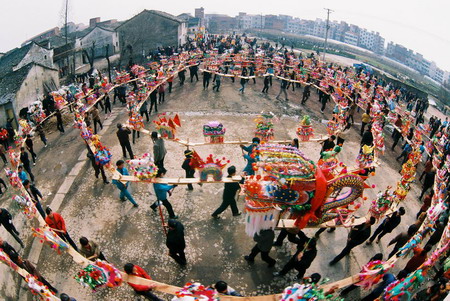 龍舞是中國民間體育藝術(shù)。大庸境內(nèi)的板凳龍是 別具一格的龍舞形式。尤其桑植縣白族人民,對舞板 凳龍有著特殊偏愛。 白族同胞耍板凳龍,相傳起于漢代,由白族先民 “舞龍求雨”的宗教活動(dòng)演變而來。 板凳龍有兩種樣式。一種是簡式板凳龍,由二個(gè) 舉長凳為頭,一人在后選適當(dāng)“舞臺”表演;另一種 是“篾扎板凳龍”,即用竹篾扎成龍形置于板凳之上 ,以木腳示龍爪,造型美觀,逼真。耍板凳龍又分兩 種舞式,一為獨(dú)凳龍,一為九節(jié)龍(九張板凳相接)。 舞板凳龍動(dòng)作有“二龍搶珠”、“黃龍穿花”、“二 龍戲水”、“金蟬脫殼”、“黃龍盤身”等。永順、 慈利還流行草把龍,其龍耳稻草扎成。龍舞還有“干 龍”、“濕龍”之分,“干龍”多為娛樂,“濕龍” 則為求雨。“龍”到之處,百姓必潑水助威,舞者一 身透濕,盛為熱烈歡快。