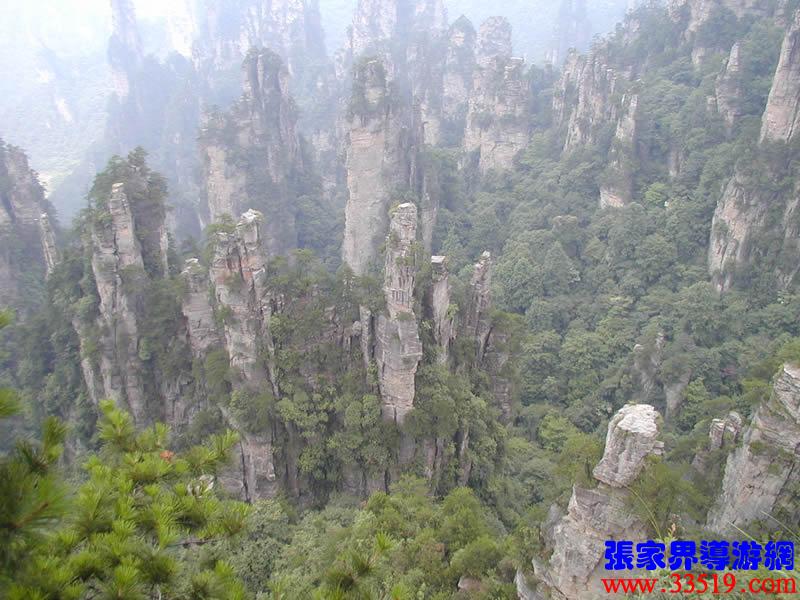 (神兵聚會(huì))從仙人橋去老屋場(chǎng),但見(jiàn)深谷里密密麻麻羅列上百座石峰,活像一群威武雄壯的將士列隊(duì)聽(tīng)令,相傳這就是向王天子的神兵在聚會(huì)。神話雖不可靠,但石峰如此集中壯觀,在武陵源也屬罕見(jiàn)。我想引用一位美術(shù)大師的話:“豈有此理,莫名奇妙,說(shuō)也不信,到此方知。”不看神兵聚會(huì),怎知石峰成林。