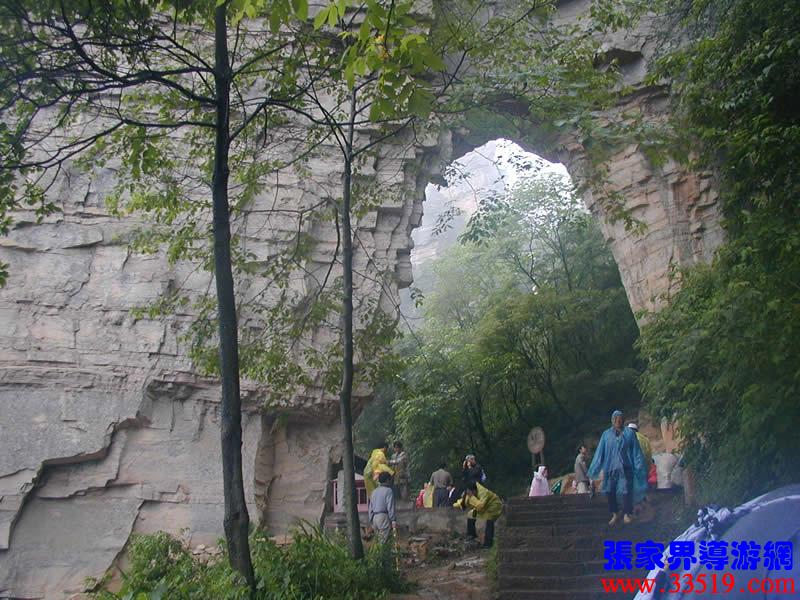(南天門)大自然的造化真奇妙,利用一塊巨大的板狀石峰鑿出一扇大門,底寬10余米,高15米。相傳當(dāng)年屈原登天臺(tái)問(wèn)天,就是從這里經(jīng)過(guò)的,故民間叫它“通天門”。據(jù)說(shuō)向王天子在水繞四門苦練三年零六個(gè)月武藝,起事那天,就是立在這兒向皇宮連射三箭,流傳在武陵源民間的“三箭射皇宮”的典故就從此來(lái)。