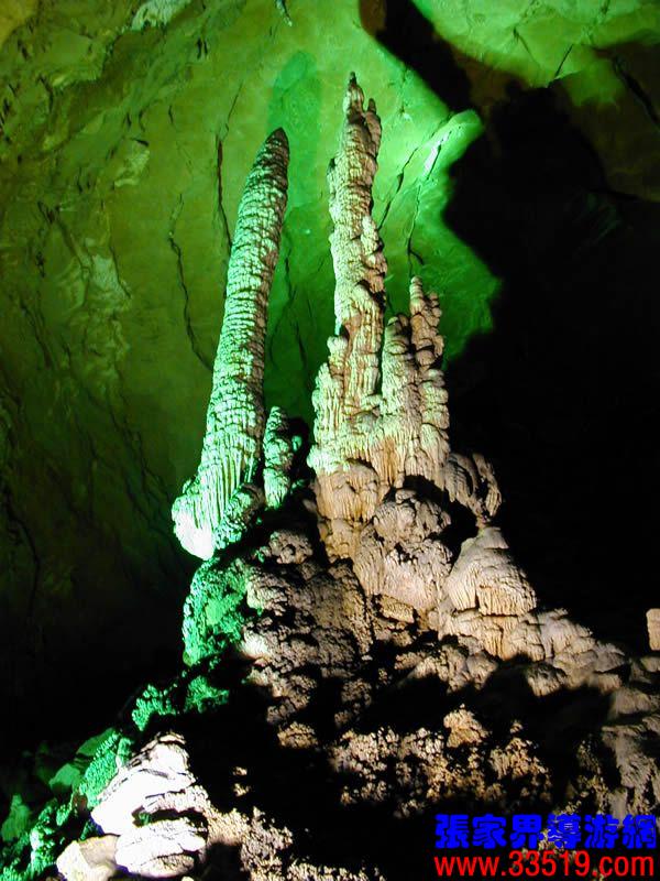 (龍宮)龍宮是黃龍洞十三個大廳中最大的一個,也是景色最美的景點之一,底面積15000平方米,平均高40米,兩千余根石筍拔地而起,千姿百態(tài),異彩紛呈,或如飛禽走獸,或如宮廷珍藏,有的像巍巍雪松,有的像火箭升空。龍宮后園有金銀兩座花池,清水常溢,花簇盛開。宮頂鐘乳柳垂簾掛,四周壁畫栩栩如生。溶解著各色各樣的礦物質(zhì)的水,從巖層中滲透出來,滴落下來。礦物質(zhì)在洞頂凝固結(jié)晶成倒懸鐘乳石,從鐘乳石滴落的水又把礦物質(zhì)澆疊、堆壘在洞底,而長成節(jié)節(jié)向上的石筍。大家看看這龍宮的造型,領(lǐng)略這磅礴的氣勢。洞內(nèi)最大石筍,高12米、直徑10米的漢白玉天然石椅“龍王寶座”居高臨下,眾多石柱石筍似人似物,維妙維肖,圍著寶座朝拜山呼,幾十座珊瑚亭亭玉立,儼然一支龐大的“宮廷樂隊”。湖南著名教授羊春秋先生作《寄生草》詞對此進行描繪:“百態(tài)千姿模樣,三宮六院門巷。龍王開宴設瓊漿,猴王偷果鬧天堂,君王納寵擁羅帳。搬演了人間爭攘,匯集了天下奇觀。”