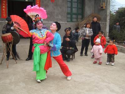 一旦一丑表演,用手巾和折扇作道具。旦的表演含蓄細(xì)膩,動(dòng)作優(yōu)美輕俏,以眉目傳情(脧眉眼)為特點(diǎn)。丑的表演活潑聰明,俏皮逗樂,動(dòng)作粗獷。流傳在境內(nèi)的地花鼓有“洗菜心”、“銅錢歌”、“望郎歌”等。