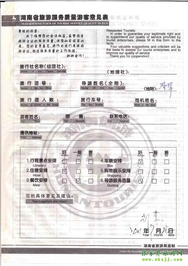 2010年7月22日劉先生旅游質(zhì)量反饋