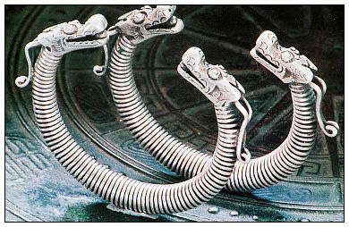 銀飾以其多樣的品種、奇美的造型和精巧的工藝,不僅向人們呈現(xiàn)了一個(gè)瑰麗多彩的藝術(shù)世界,而且也展示出一個(gè)有著豐富內(nèi)涵的精神世界。銀飾的種類(lèi)較多,從頭到腳,無(wú)處不飾。除頭飾、胸頸飾、手飾、衣飾、背飾、腰墜飾外,個(gè)別地方還有腳飾。